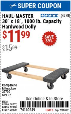 HAUL-MASTER 30 In x 18 In 1000 lb. Capacity Hardwood Dolly - Item 61897 ... Compare our price of $16.99 to MILWAUKEE at $21.98 (model number: 33700). Save 23% by shopping at Harbor Freight. Specifications Shop Now for Item 61897 HAUL-MASTER 30 In x 18 In 1000 lb. Capacity Hardwood Dolly - Item 61897 / 38970 / 39757 / 60496 / 62398 / 92486 Browse Our Most Viewed Deals 20% Off Deals Items Under $10 Air Compressors Tarps